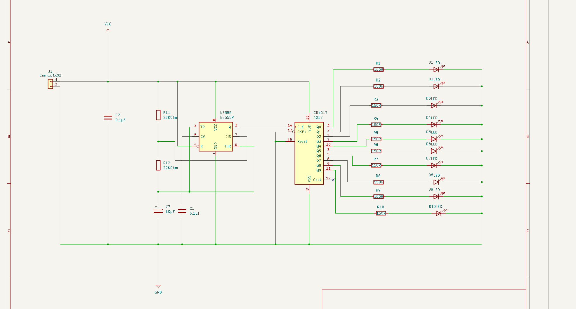 The NE555 produces a square wave at its output pin. This signal is connected to the clock input of the CD4017. I calculated the frequency using the astable timing formula and selected resistor values from the E12 series to achieve approximately 4 Hz. This frequency creates a smooth running light effect.
