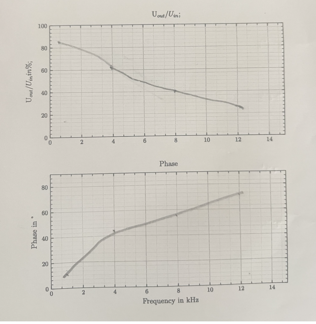 The low-pass filter was constructed using the same components arranged in a different configuration. In this case, low frequencies pass through with minimal attenuation, while higher frequencies are reduced. The oscilloscope was adjusted to display one full period of the signal to ensure accurate measurement of amplitude and phase shift. The experiment confirmed the expected frequency response and demonstrated the practical difference between high-pass and low-pass filter behavior.