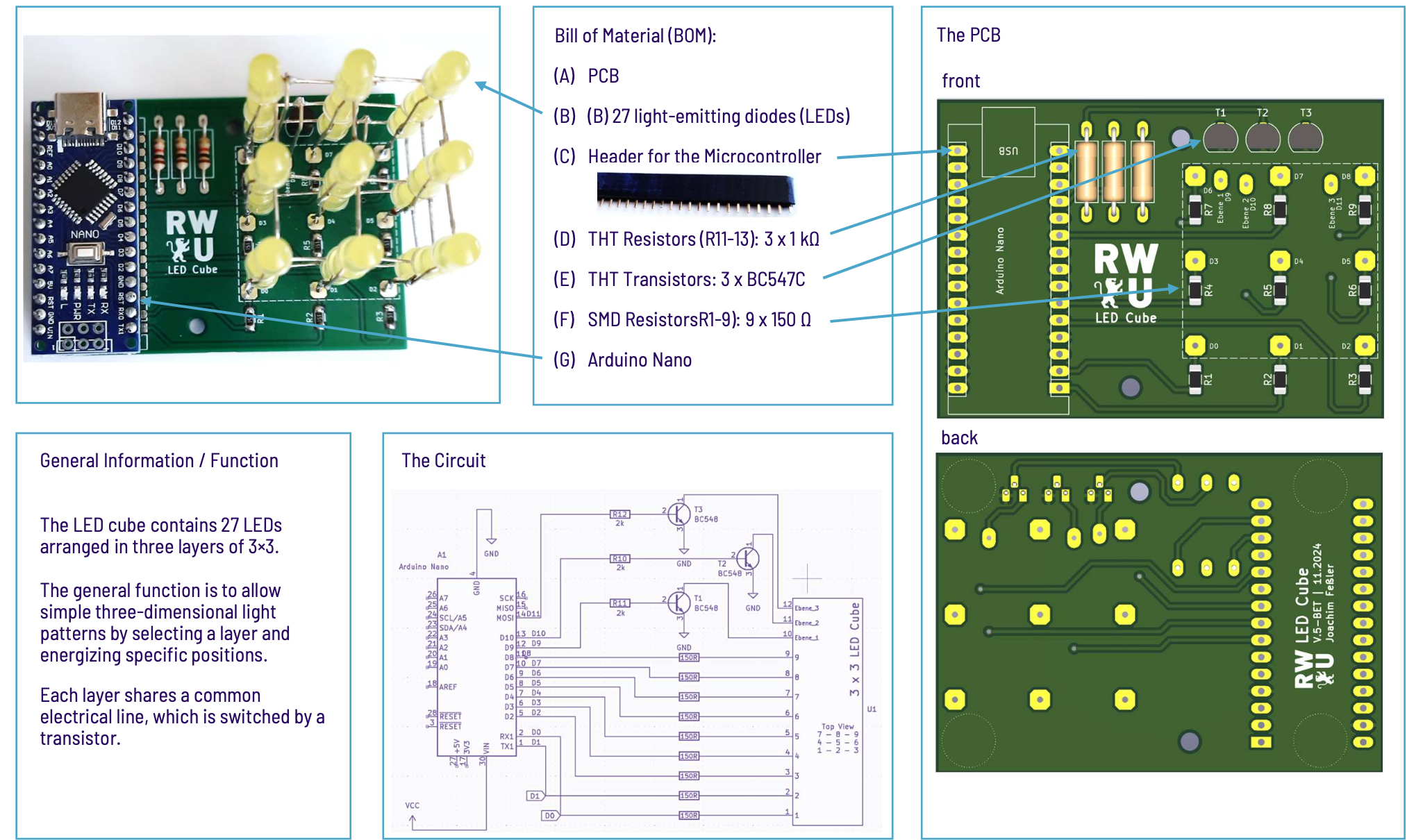 The assembly began by bending and soldering the 27 LEDs into three separate 3×3 layers. Each layer was tested before stacking to ensure electrical reliability. After constructing the cube structure, I soldered the SMD resistors, THT resistors, and BC547C transistors onto the PCB. The final step was mounting the cube onto the board and performing a complete functional test. The finished system demonstrates clean soldering quality, proper alignment, and reliable transistor-based layer switching.